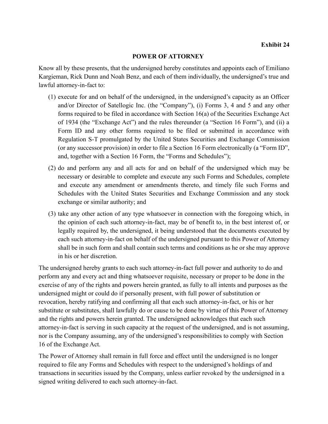 Exhibit 24 POWER OF ATTORNEY Know all by these presents, that the undersigned hereby constitutes and appoints each of Emiliano Kargieman, Rick Dunn and Noah Benz, and each of them individually, the undersigned’s true and lawful attorney-in-fact to: (1) execute for and on behalf of the undersigned, in the undersigned’s capacity as an Officer and/or Director of Satellogic Inc. (the “Company”), (i) Forms 3, 4 and 5 and any other forms required to be filed in accordance with Section 16(a) of the Securities Exchange Act of 1934 (the “Exchange Act”) and the rules thereunder (a “Section 16 Form”), and (ii) a Form ID and any other forms required to be filed or submitted in accordance with Regulation S-T promulgated by the United States Securities and Exchange Commission (or any successor provision) in order to file a Section 16 Form electronically (a “Form ID”, and, together with a Section 16 Form, the “Forms and Schedules”); (2) do and perform any and all acts for and on behalf of the undersigned which may be necessary or desirable to complete and execute any such Forms and Schedules, complete and execute any amendment or amendments thereto, and timely file such Forms and Schedules with the United States Securities and Exchange Commission and any stock exchange or similar authority; and (3) take any other action of any type whatsoever in connection with the foregoing which, in the opinion of each such attorney-in-fact, may be of benefit to, in the best interest of, or legally required by, the undersigned, it being understood that the documents executed by each such attorney-in-fact on behalf of the undersigned pursuant to this Power of Attorney shall be in such form and shall contain such terms and conditions as he or she may approve in his or her discretion. The undersigned hereby grants to each such attorney-in-fact full power and authority to do and perform any and every act and thing whatsoever requisite, necessary or proper to be done in the exercise of any of the rights and powers herein granted, as fully to all intents and purposes as the undersigned might or could do if personally present, with full power of substitution or revocation, hereby ratifying and confirming all that each such attorney-in-fact, or his or her substitute or substitutes, shall lawfully do or cause to be done by virtue of this Power of Attorney and the rights and powers herein granted. The undersigned acknowledges that each such attorney-in-fact is serving in such capacity at the request of the undersigned, and is not assuming, nor is the Company assuming, any of the undersigned’s responsibilities to comply with Section 16 of the Exchange Act. The Power of Attorney shall remain in full force and effect until the undersigned is no longer required to file any Forms and Schedules with respect to the undersigned’s holdings of and transactions in securities issued by the Company, unless earlier revoked by the undersigned in a signed writing delivered to each such attorney-in-fact.