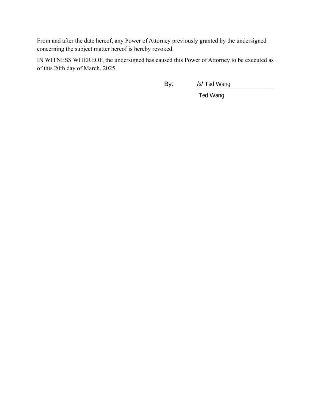 From and after the date hereof, any Power of Attorney previously granted by the undersigned concerning the subject matter hereof is hereby revoked. IN WITNESS WHEREOF, the undersigned has caused this Power of Attorney to be executed as of this 20th day of March, 2025. By: /s/ Ted Wang Ted Wang